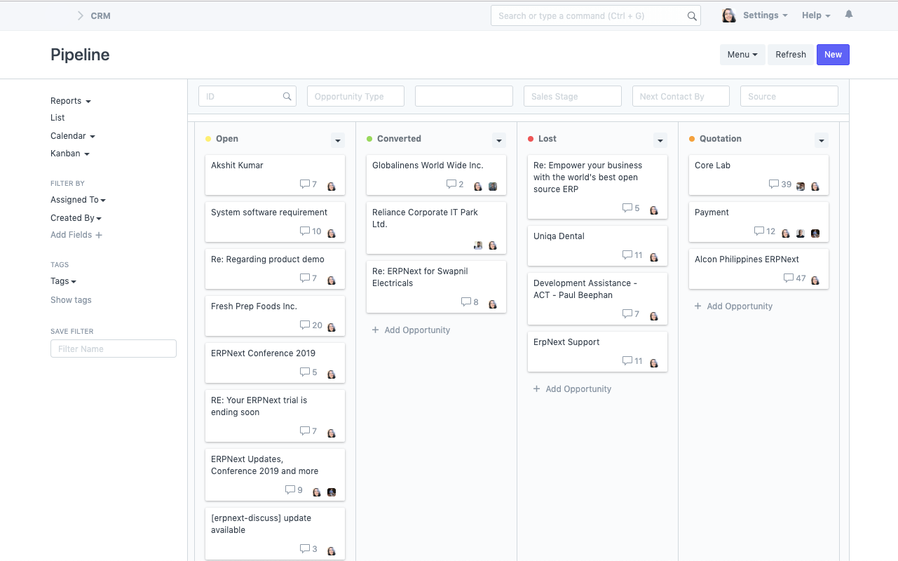 يتضمن نظام CRM مفتوح المصدر من ERPForever عرضًا في الوقت الفعلي لفرص المبيعات والتسويق المهمة. يساعدك هذا في صياغة إستراتيجية لزيادة معدلات التحويل من الرصاص إلى الصفقة.