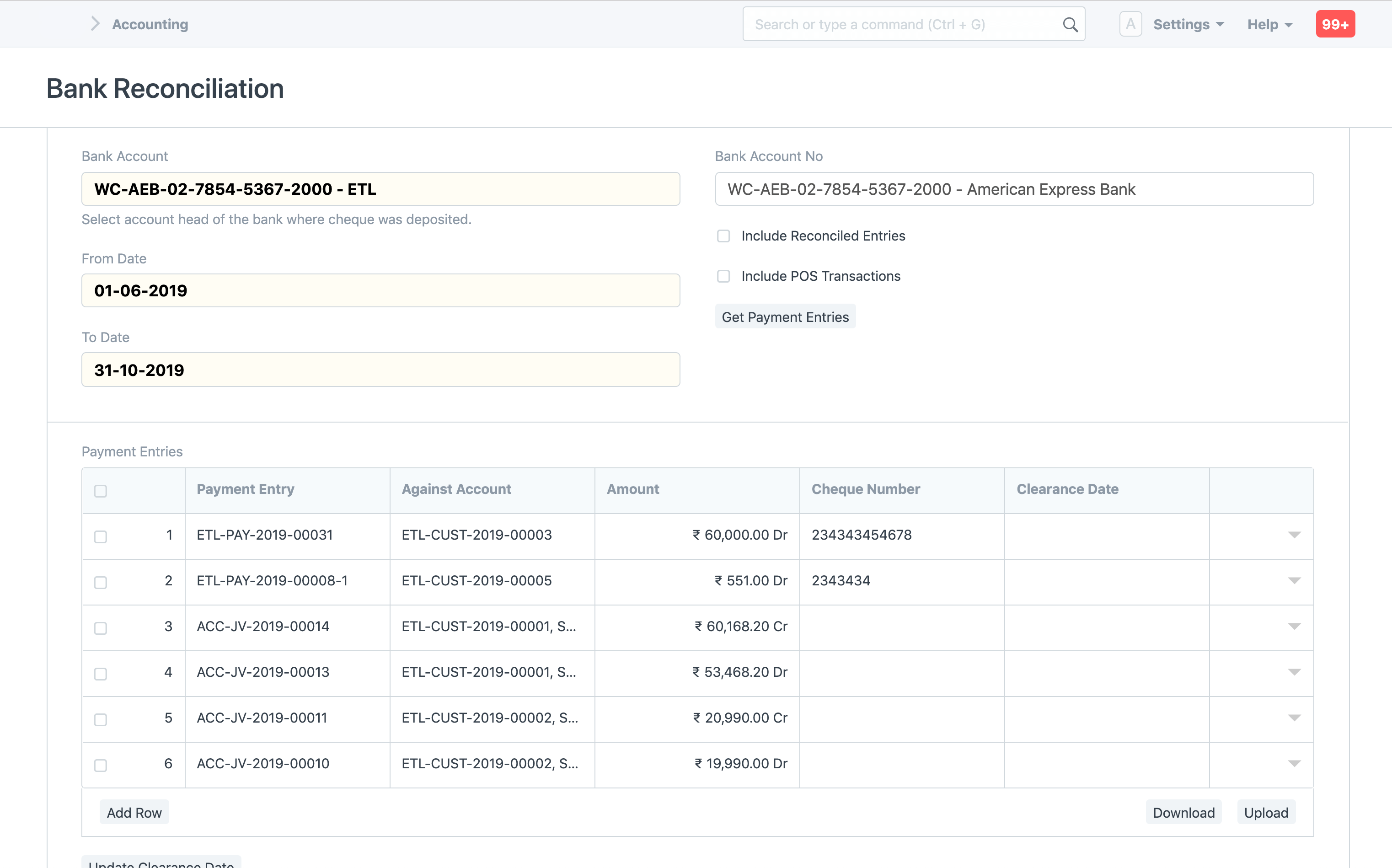 إنشاء حسابات بنكية ونقدية غير محدودة ، وتتبع أرصدتها الافتتاحية والجارية. احتفظ بحسابات مصرفية لمورديك وعملائك. تأكد من مزامنة بياناتك المالية من خلال تحميل كشف حساب بنكي بنقرة واحدة. لقد أصبح التخليص سهلاً ، كما أصبحت عملية المحاسبة أسهل.