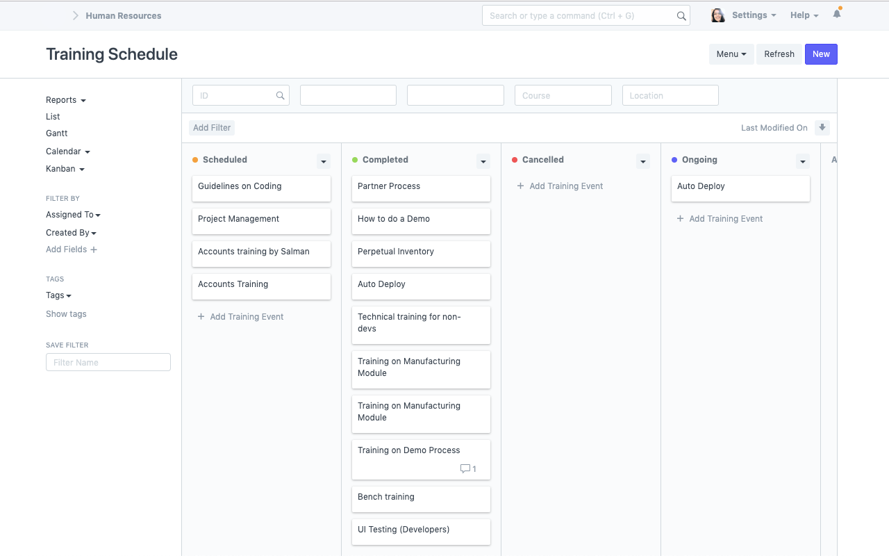 استمر في تطوير مهارات فريقك من خلال وحدة برنامج تدريب الموارد البشرية. قم بجدولة أحداث التدريب لموظفيك ، والتي يتم ربطها تلقائيًا بتقاويم الموظفين حتى يتمكن الجميع من عرض التدريبات المجدولة وتخطيط قوائم المهام الخاصة بهم وفقًا لذلك.