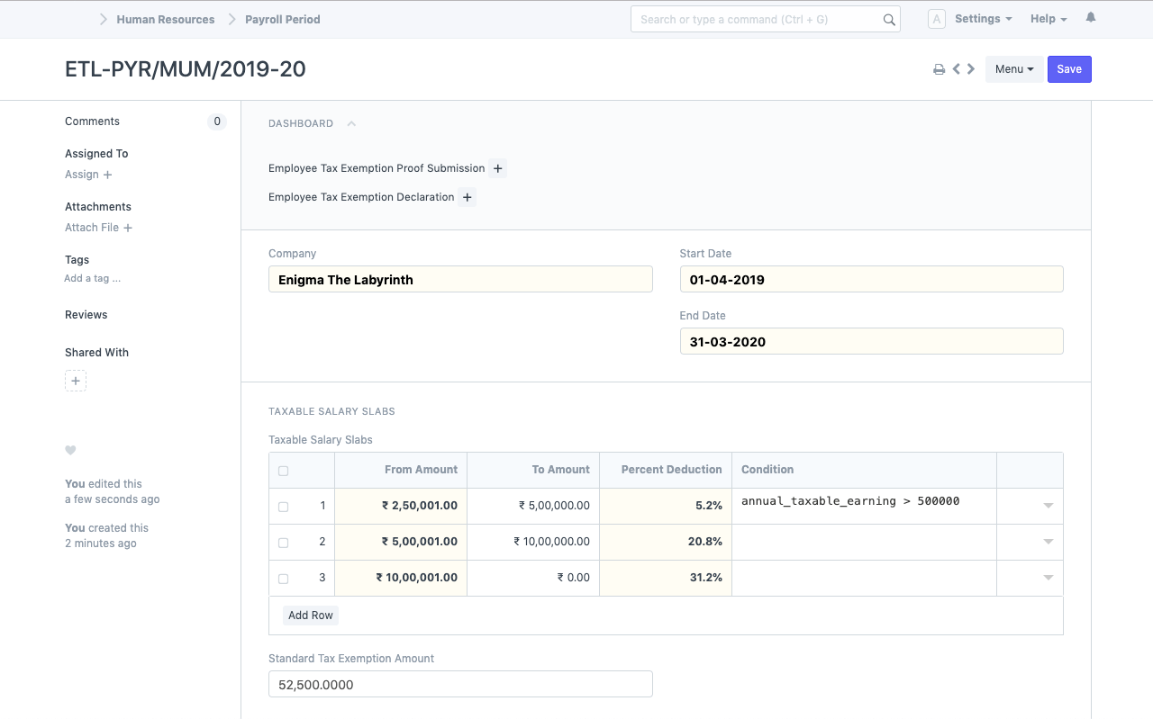 حدد فترة معالجة كشوف المرتبات (السنة المالية أو الشهرية ، إنها مكالمتك) وقم بتعيين ألواح رواتب الضرائب للموظفين. يمكنك أيضًا إضافة عدة ألواح ضريبية لفترة الرواتب اعتمادًا على اللوائح الضريبية لبلدك.